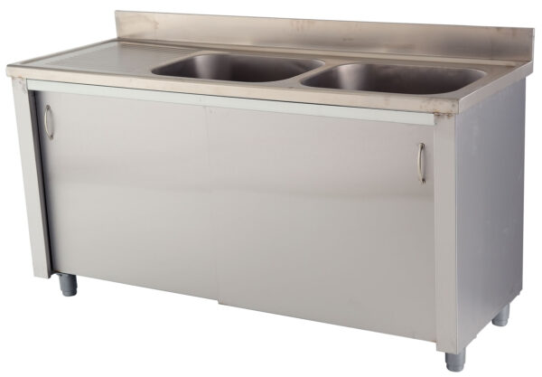 Ανοξείδωτη λάντζα κλειστή με συρόμενες πόρτες. Διαθέτει 2 γούρνες 50Χ50 εκ. Διάσταση 160Χ70Χ86 εκ.